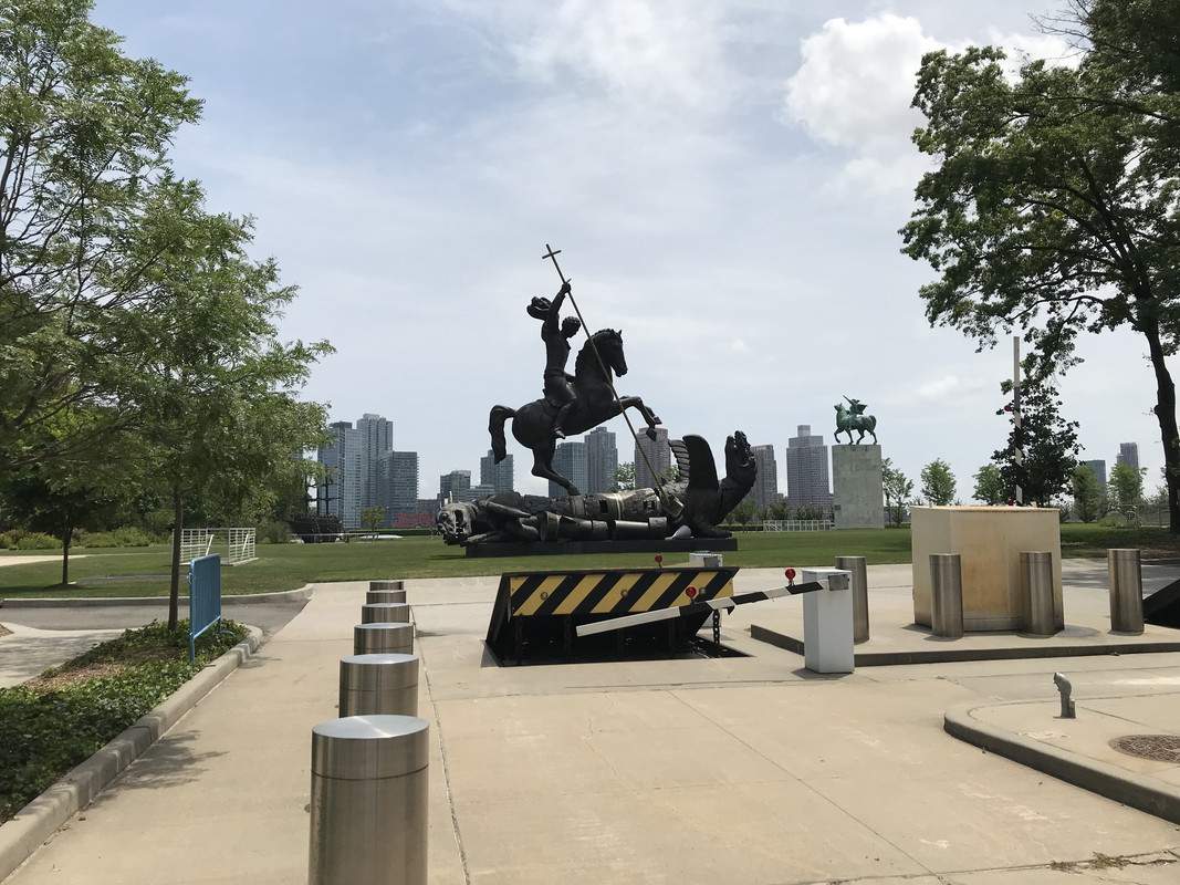 UN Gift Garden – «Good Defeats Evil» mide 12 metros de alto. El artista dijo que el diseño se le apareció en un sueño. Había estado trabajando en una aldea en Georgia donde un grupo de niños soviéticos y estadounidenses estaban celebrando el tratado. Esa noche vio a San Jorge destruyendo al dragón de misiles. Supo así que tenía que crear la estatua.